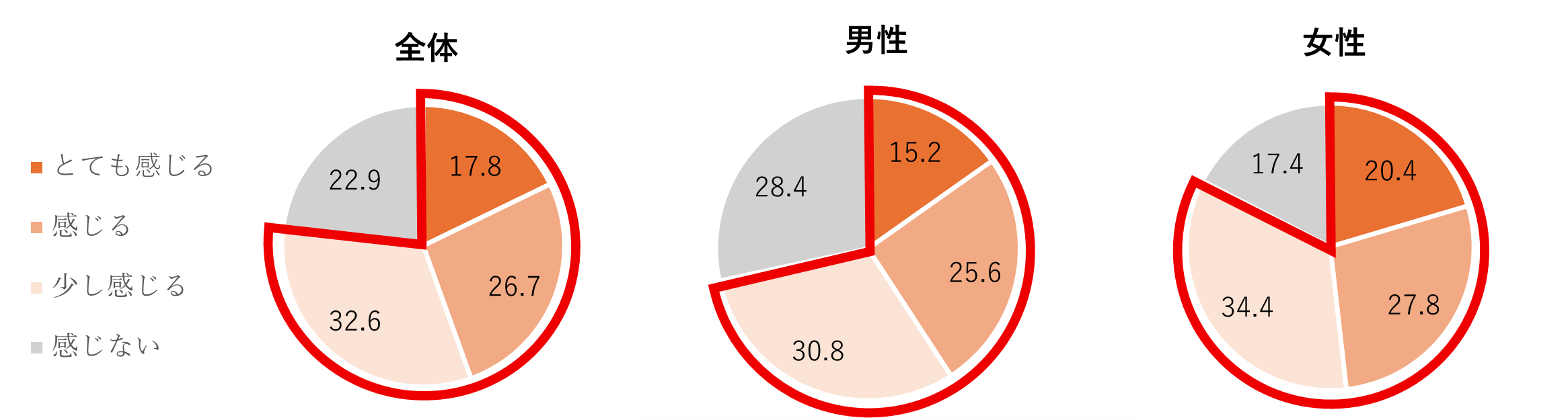 「日常生活の中で、どれくらいの頻度で「疲労感」を感じますか。」 という質問に対し、週に1回以上「感じる」と答えた割合は全体で8割に上った。また、男女別で見た場合も、男性は76.0%、女性は84.0%が「感じる」と回答し、女性のほうが疲労を感じていることがわかった。
