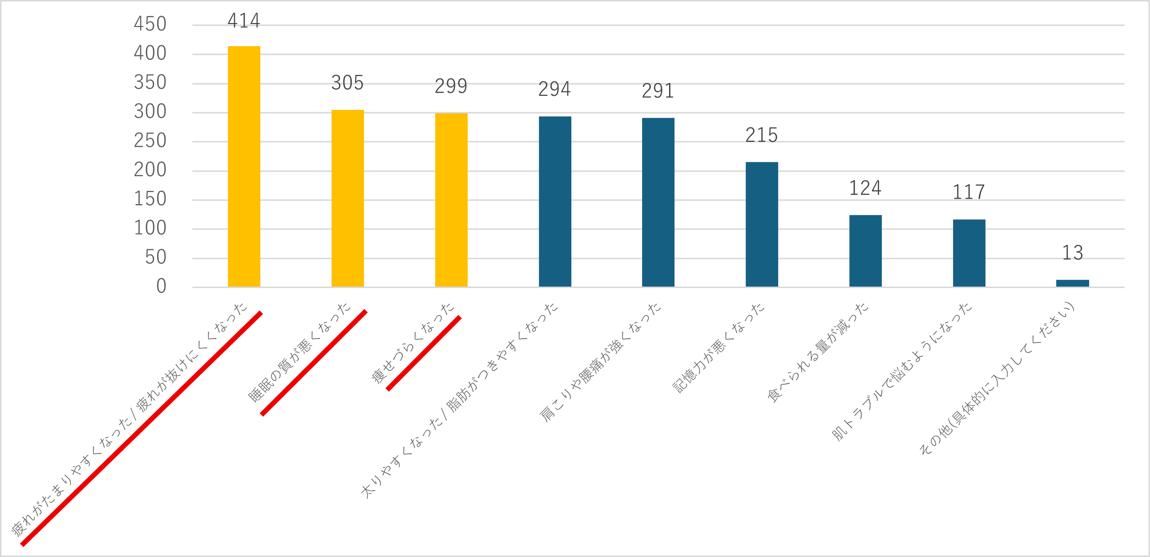 ・カラダの不調を感じているトップ3は「疲れがたまりやすく、抜けにくくなった」「睡眠の質が悪くなった」「痩せづらくなった」の順。中でも、「疲れがたまりやすく、抜けにくくなった」(疲労を感じている)と回答した人が、2人に1人。